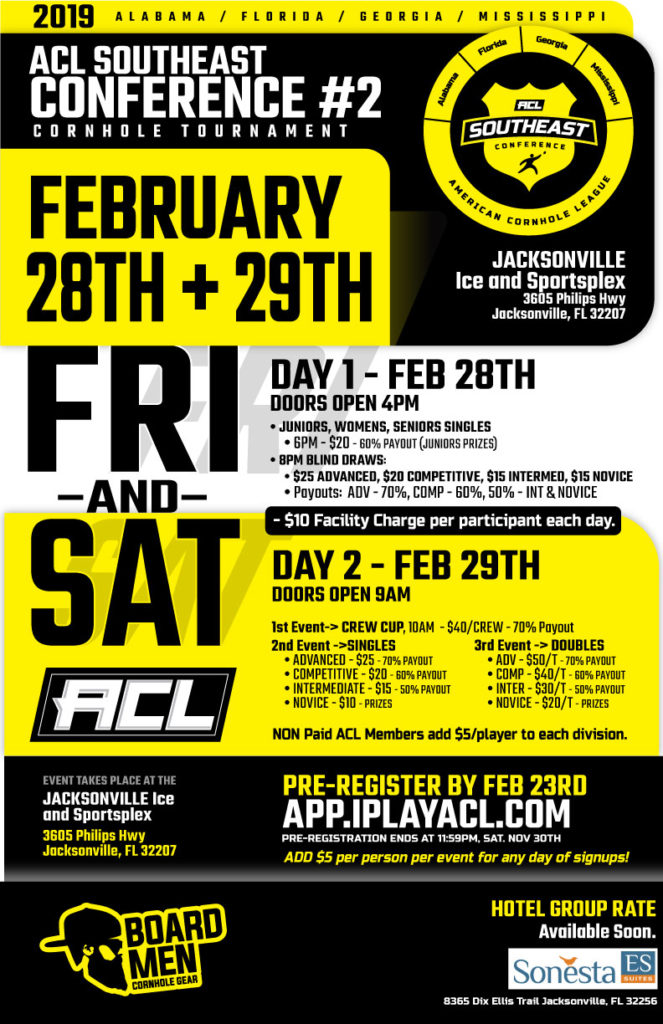 This event has passed. Click here for more information. Like +1 Add to calendar Google Calendar iCalendar Outlook 365 Outlook Live Details Start: February 28, 2020 @ 4:00 pm End: February 29, 2020 @ 11:00 pm Cost: $20 – $100 Event Categories: ACL, ACL Conference Event, ACL Regional, ACL Singles, Blind Draw, Bring Your Own Partner Tournaments, Cornhole Tournaments, Featured, Singles Organizer: South Florida Cornhole