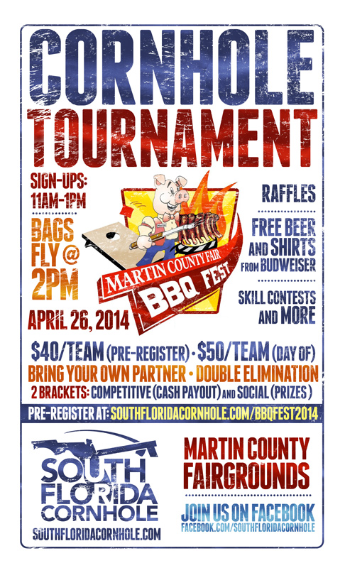 Get ready South Florida! This will be a great day of cornhole with “bring your own partner” teams from all over at an awesome festival filled with vendors, live music, BBQ, rides, and more! We are very excited to have Budweiser supplying us with FREE BUDWEISER T-SHIRTS for all players and FREE BEER if you are wearing the free shirt! We have 3 sets of brand new cornhole boards and bags to offer as prizes and raffles for all in attendance along with many other awesome prizes and offers from our sponsors for anyone to win. We will have a couple other cornhole contests throughout the tournament too (open to anyone). Contests such as “Bag-a-Buck”, 4-Bag Challenge, and more.